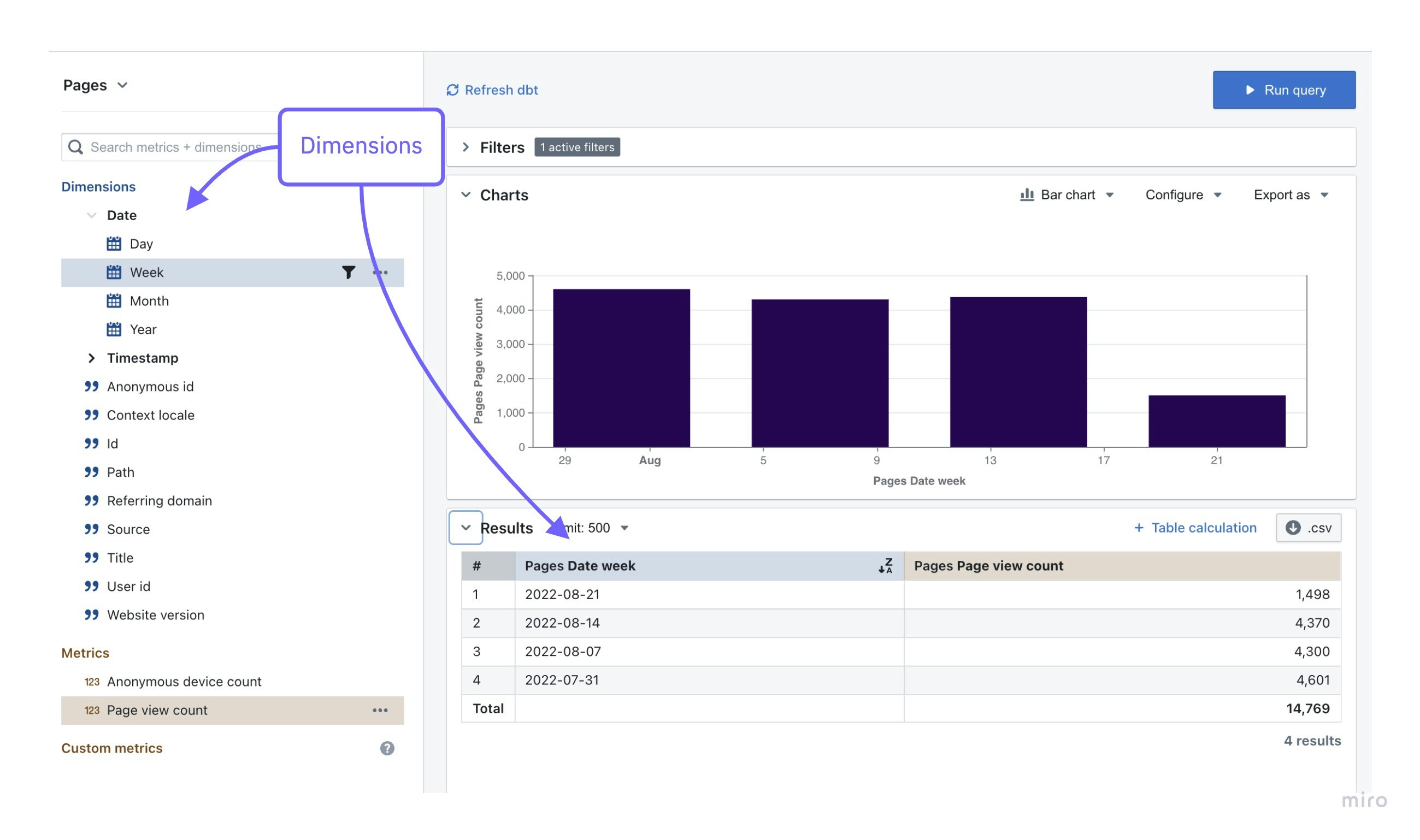 Once you’ve added your dimensions, you can use them in Lightdash to build charts and filter results. Dimensions appear in the Explore view, above metrics and, if selected, pop us as blue fields in your results table.