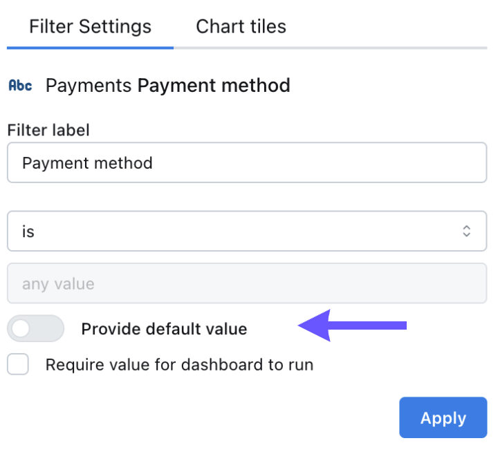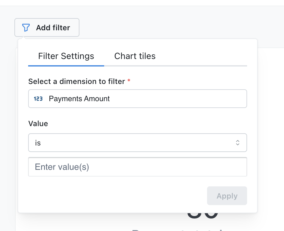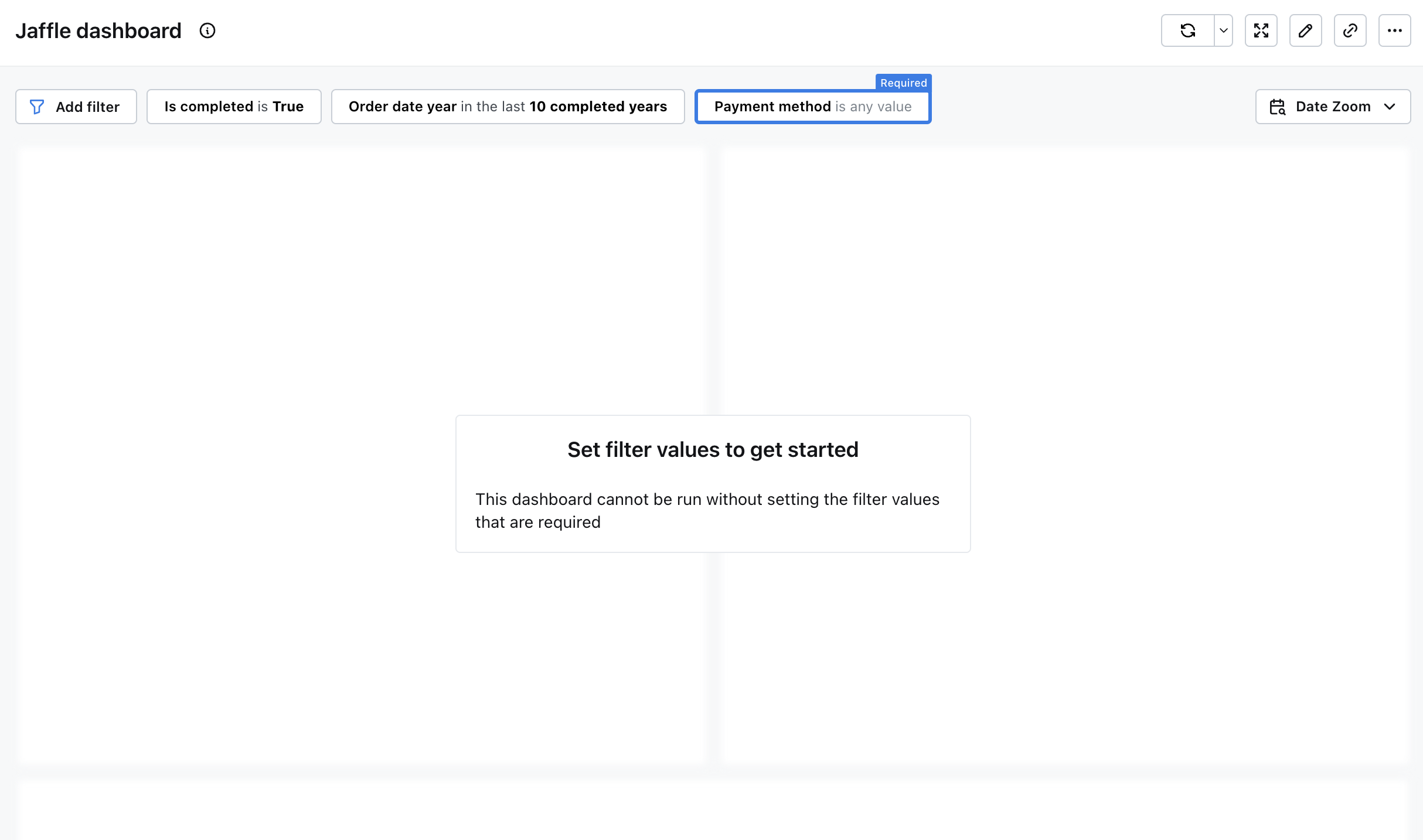 You might want to add an empty-value filter so that your dashboard viewers can choose their own value and explore the data based on their own criteria. Your dashboard viewers might also want to add their own filters to your dashboard.Adding an empty-value filter