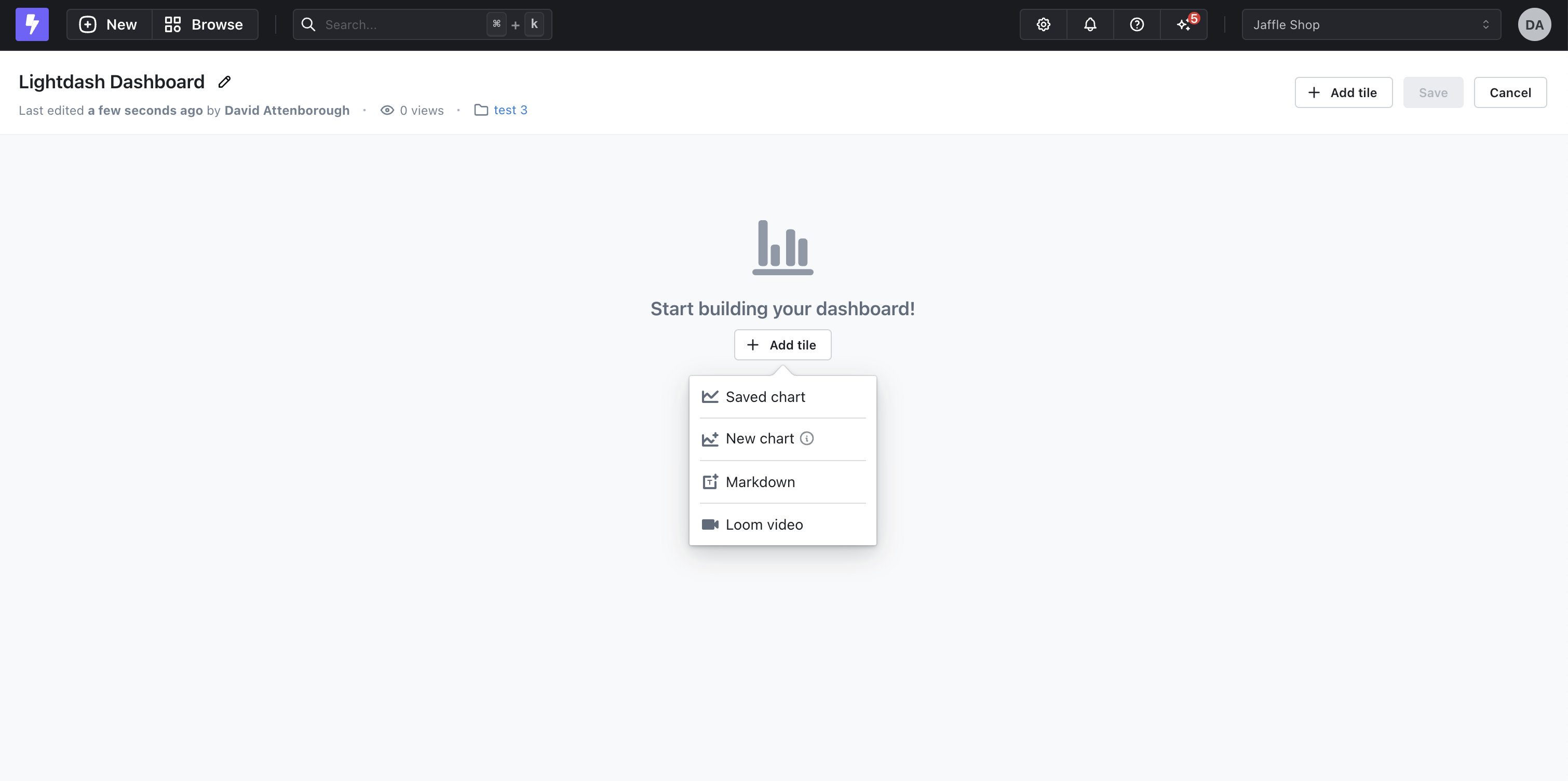 Creating charts from within a dashboard helps to keep your spaces and projects clutter-free from charts that are used only once in a dashboard. Charts that are created from within your dashboard are exclusive to the dashboard. This means that they can’t be reused in other dashboards in your project. Click “Add tile” and then “New chart” to create a chart that is exclusive to the dashboard. You will be taken to the chart builder. Once you save the chart it will appear at the bottom of your dashboard.