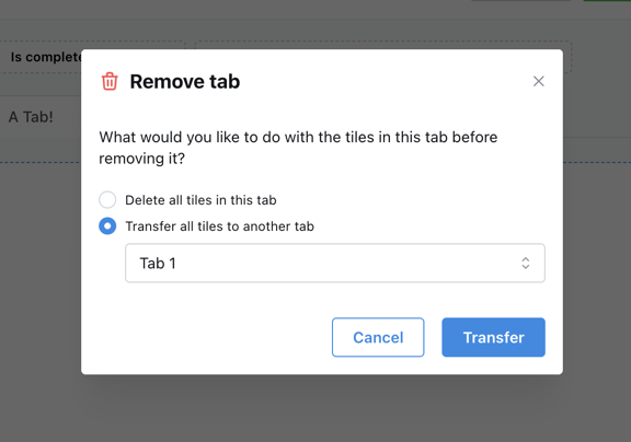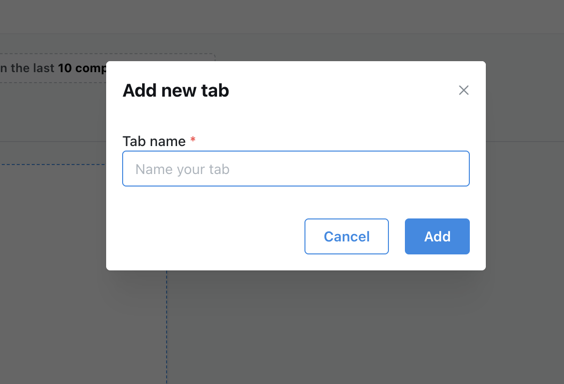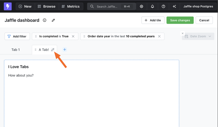 To edit a tab, click on the edit icon to the right of your tab name while in dashboard edit mode. You can either rename or remove the tab from your dashboard.