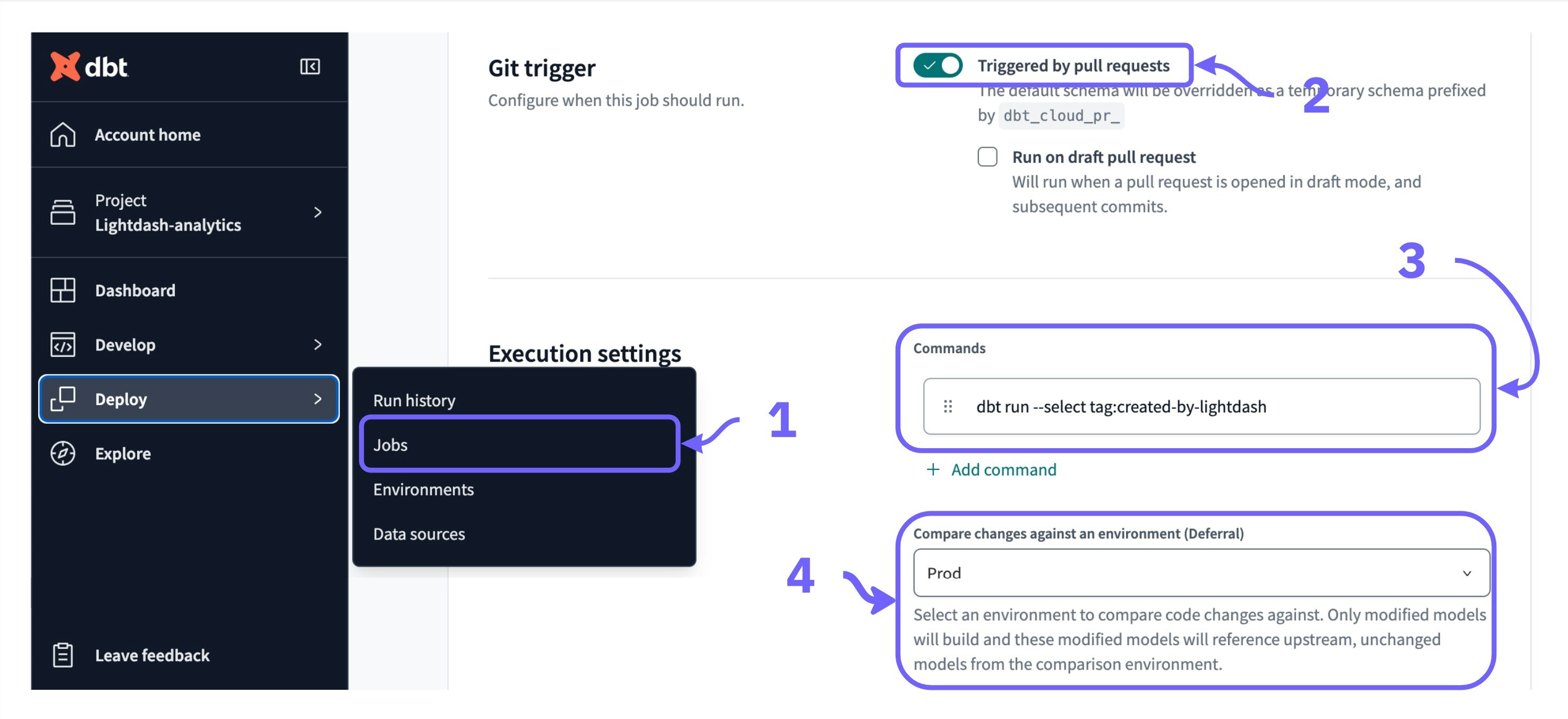 If you’re using dbt Cloud to manage your dbt project, you can create a job that will automatically run any new models with the tagcreated-by-lightdash